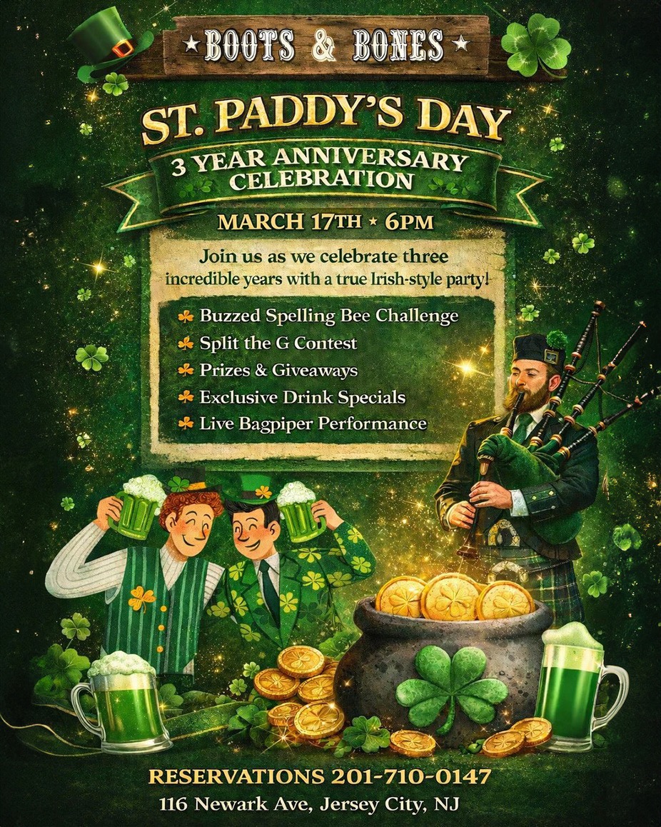 #StPaddysDay #BootsAndBonesJC #3YearAnniversary #JerseyCityEvents #IrishParty #LuckOfTheIrish #SplitTheG #CelebrateInGreen